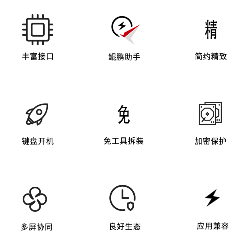 存储 | 标配M.2 256G SSD 硬盘,容量最大支持1T,支持扩展 SATA 硬盘 |