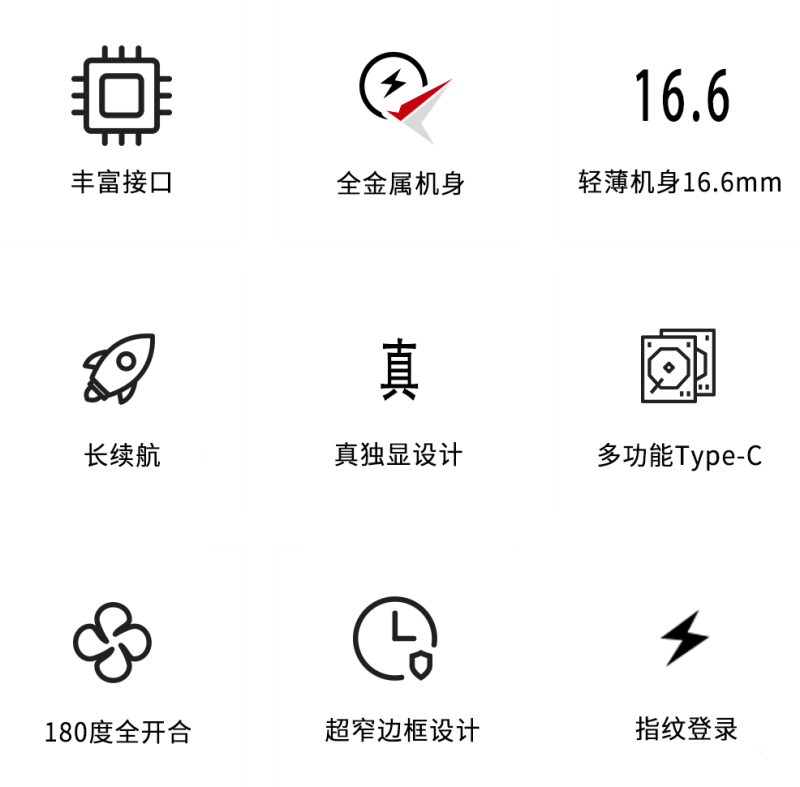 其它 | 内置100万高清摄像头;指纹/开机按键二合一;WiFi6;摄像头电子开关 |